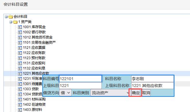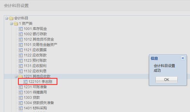 假设:销售部李志刚经常出差借款、还款,需要在“其他应收款下”科目下设置二级科目“李志刚”。